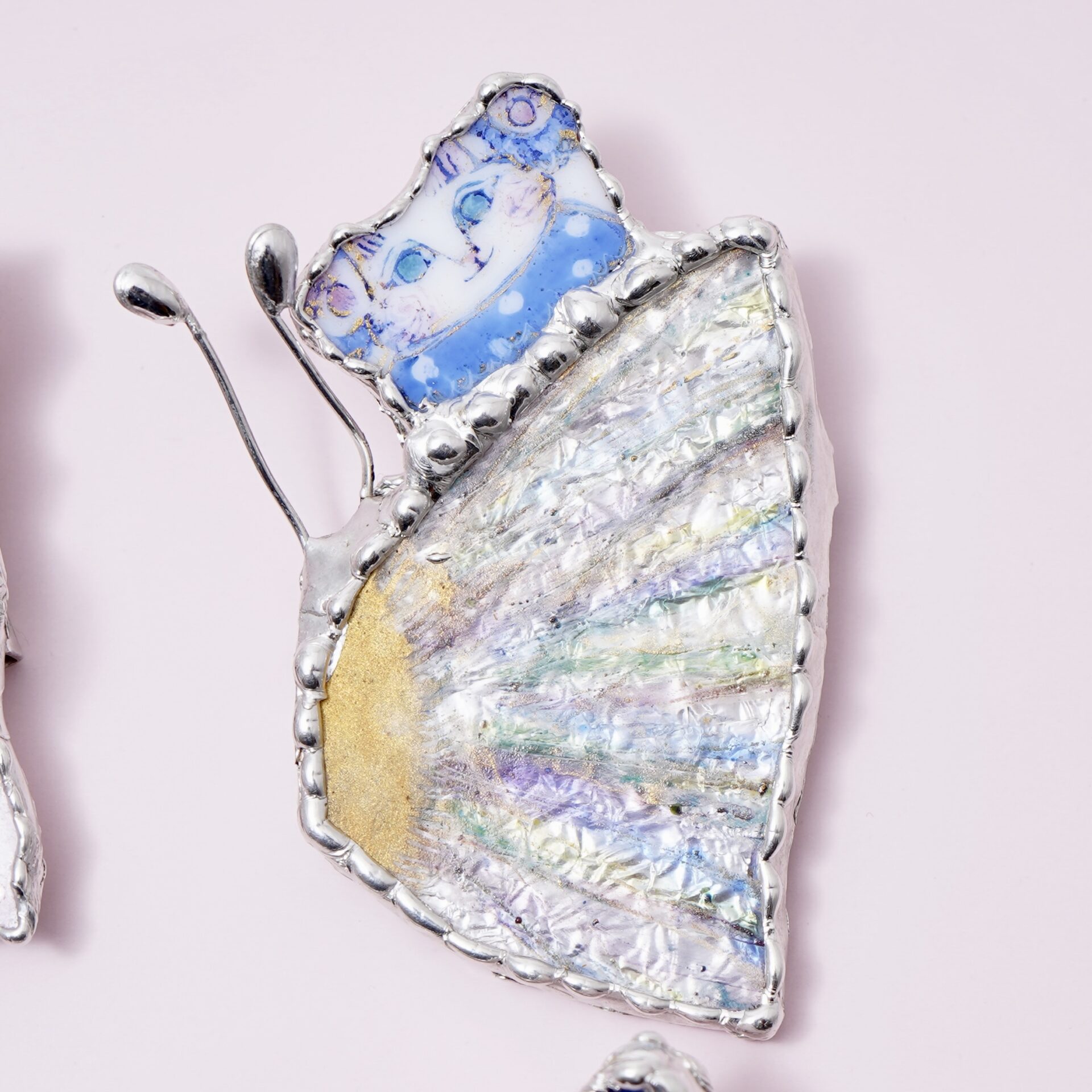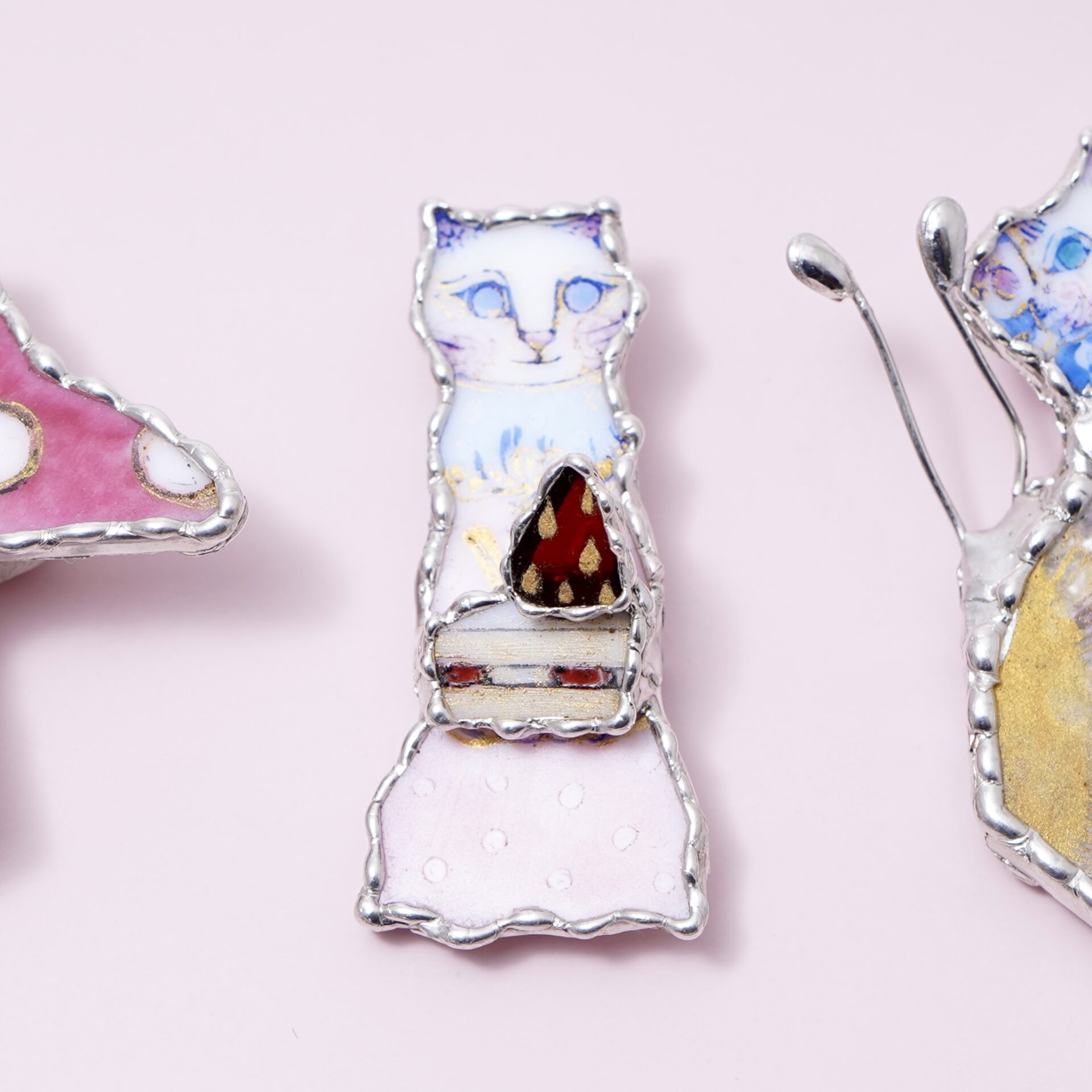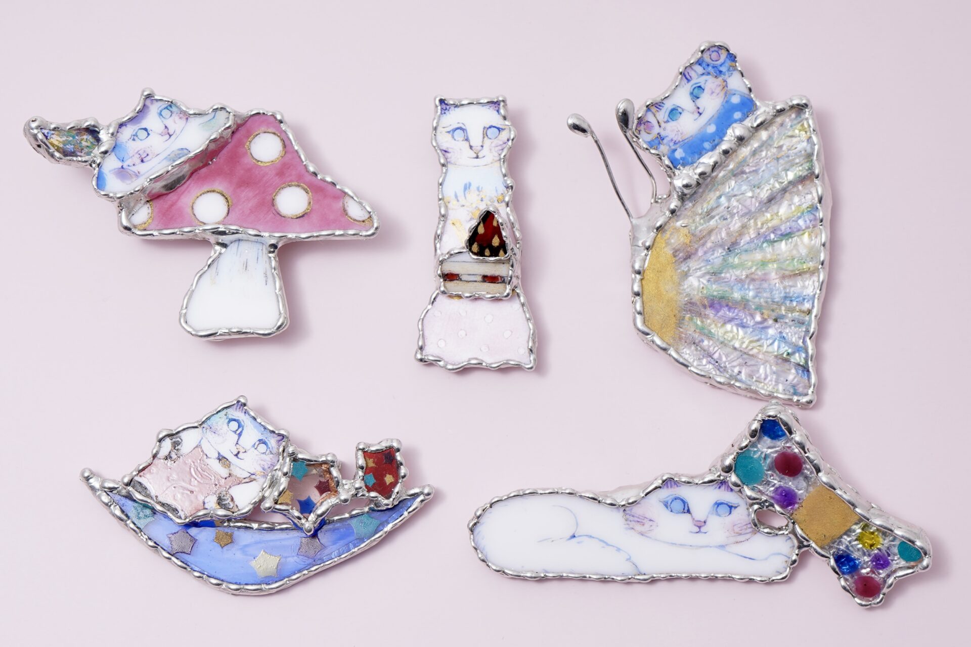 クルテさんの手で色や絵が施されたガラスのパーツは光のかけらのように美しく、作品となって命が吹き込まれていきます。