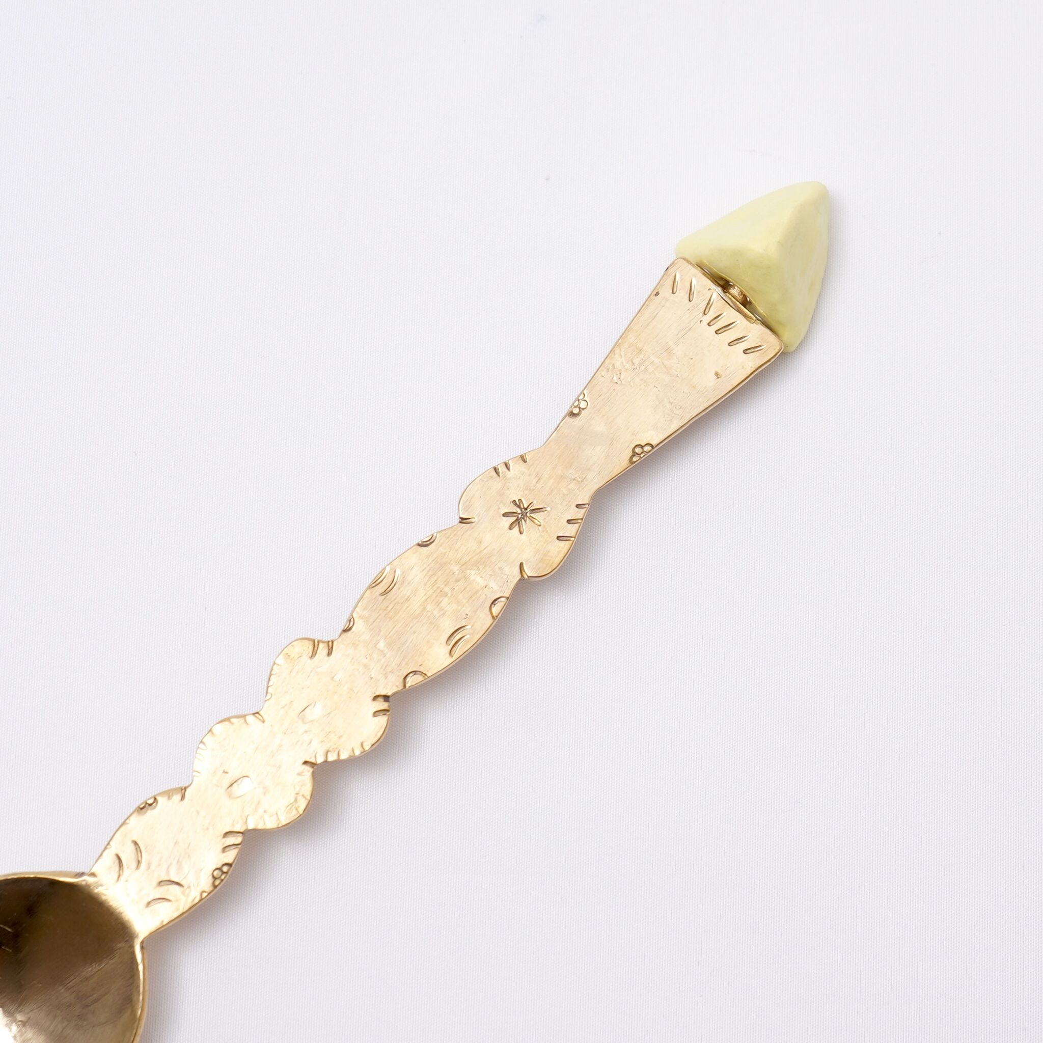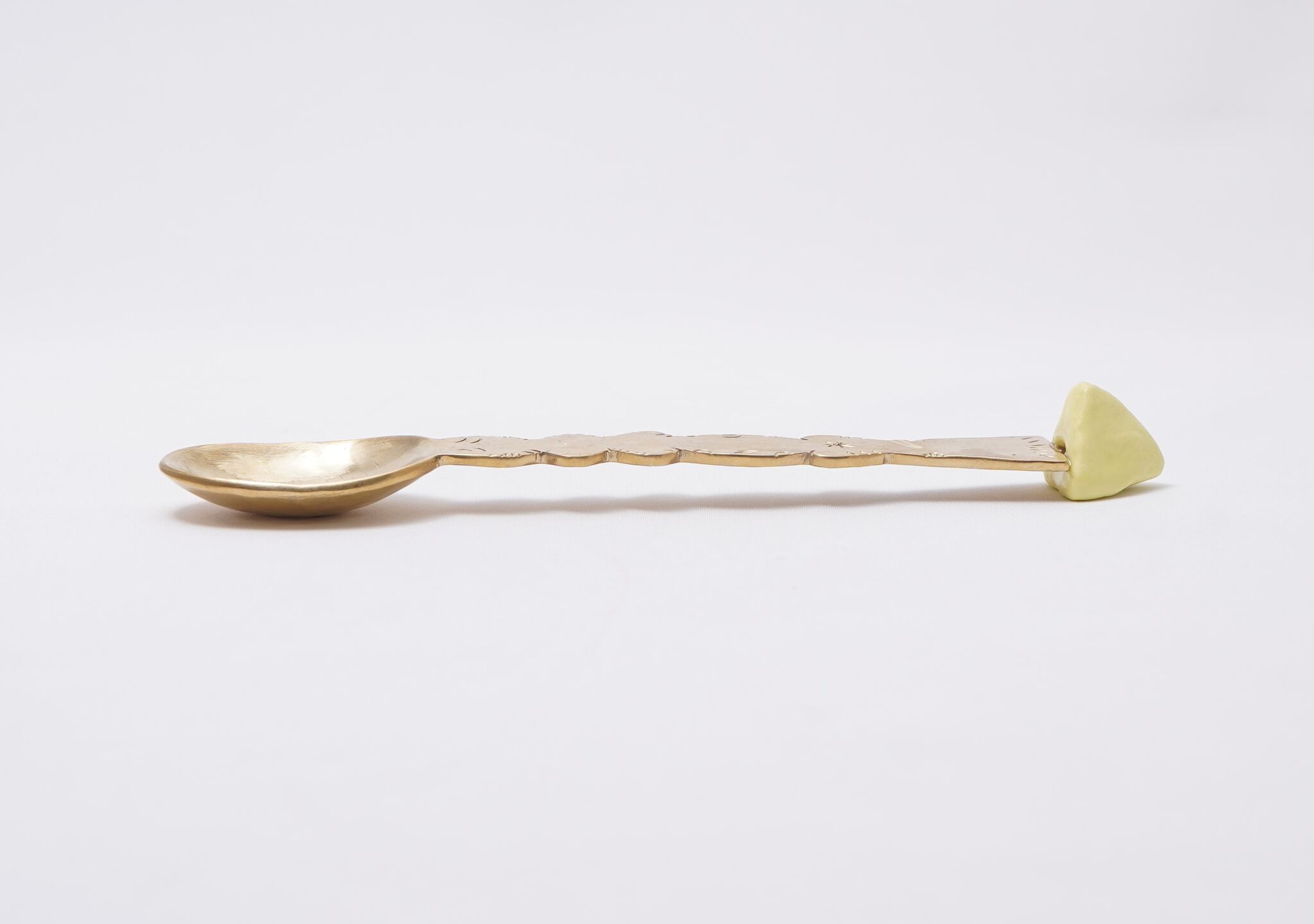 絵本から飛び出してきたような、とても可愛らしい真鍮のカトラリーです。中村かおりさんとのコラボ作品で、色付きの磁器の部分が中村かおりさん作です。